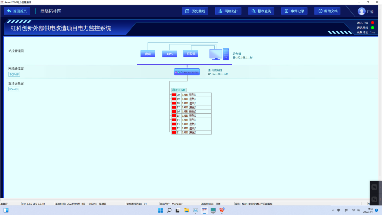 Acrel-2000电力监控系统支持实时监视接入系统的各设备的通信状态,能够完整地显示整个系统网络结构;可在线诊断设备通信状态,发生网络异常时能自动在界面上显示故障设备或元件及其故障部位。