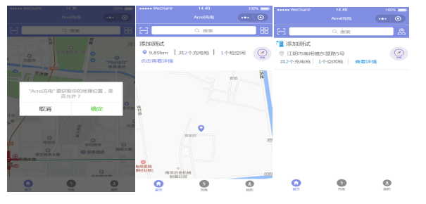 初次进入主功能页时需要授权定位才可以使用地图相关功能,在地图上查看到当前所在区域的充电站,查看充电站信息,可以进行扫码充电操作,地图导航等。