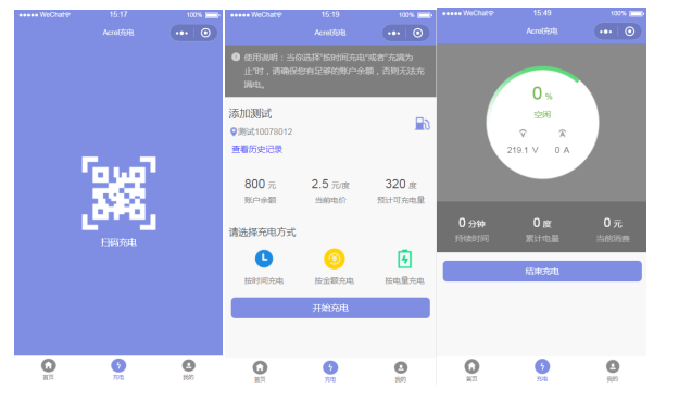 扫描充电枪上的二维码,如果当前充电桩可用即可进入充电选择页面,可以查看到当前的充电站名称、充电枪名称,以及当前的账户余额,电价和预计可充电量等数据,还可以查看当前账户的历史充电记录。充电方式分为按时间充电、按金额充电、按电量充电这三种方式。充电结束可以进进行评价。