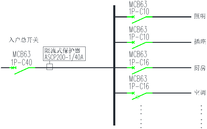 ASCP200-1型电气防火限流式保护器建议安装在入户开关下端,额定电流值根据入户开关的具体规格进行设置,典型应用示意图如图2所示: