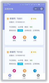 在线支付:商户可以通过小程序或者微信公众号实现在线自助充值水电费,也可以实时关注商铺用水用电情况。