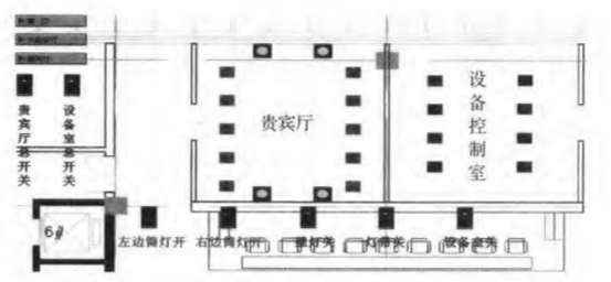 系统经过编程调试,测试运行结果如图3所示。图3为贵宾厅组态软件Wimwitch3的监控界面图,监控界面上设置总开关和各组灯光分开关,可分别对现场灯光进行集中控制。当前,左边筒灯和右边筒灯处于打开状态,其余灯光处于关闭状态,满足控制要求。应用过程中,系统现场面板和感应器的控制状态可实时反馈到监控界面,监控界面的控制命令也通过KNX总线传输到驱动器,进行相应的动作,具有很好的交互性。当出现开关面板或监控界面开关打开而灯光不亮时,可检查总线是否工作正常、驱动器是否正常及回路断路器是否处于打开的状态,判断故障原因,便于查找故障。系统采用6324面板具有遥控控制功能,通过相应的遥控开关,可实现系统的遥控控制。