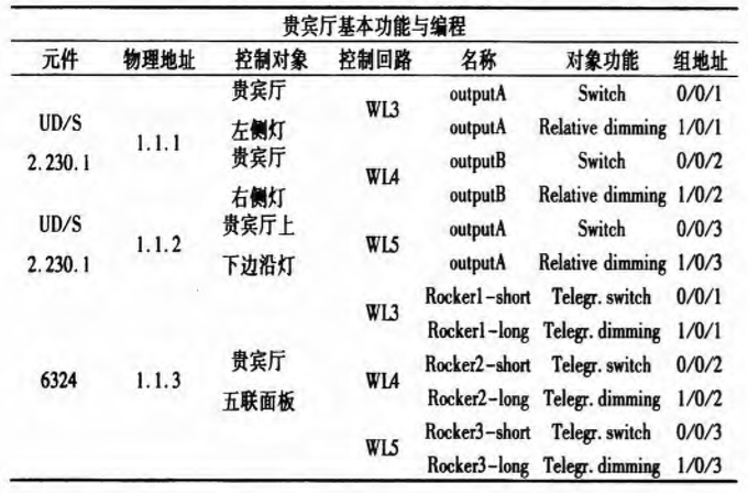 在硬件设计完成的基础上,根据报告厅智能照明控制要求, 需要对智能照明系统进行软件设计,基于KNX总线的智能照明控制系统的软件编程采用ETS3编程软件实现,编程时首先在ETS3中创建房间,在房间中添加传感器、执行器和总线元件,设置传感器和执行器的物理地址,分别下载物理地址。之后根据功能的不同设置组地址,功能相同的对象组地址相同,传感器同一功能只能有一个组地址,执行器组地址根据控制功能的不同可以划分多个组地址。考虑到整个应用系统程序较长,选取贵宾厅灯光控制来介绍软件编程设计,贵宾厅五联面板的第一、二、三联分别控制WL3、WL4、WL5回路,每联面板的短按为对回路进行开关控制,长按为对回路进行调光控制,基本功能与编程如图2所示。