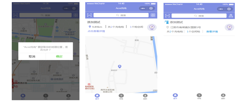 初次进入主功能页时需要授权定位才可以使用地图相关功能,在地图上查看到当前所在区域的充电站,查看充电站信息,可以进行扫码充电操作,地图导航等。