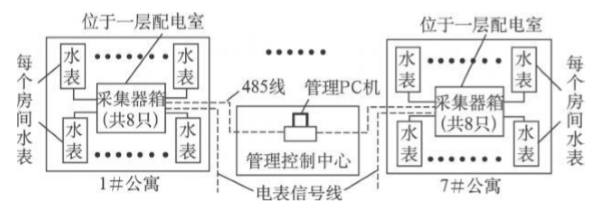 每栋公寓的每个房间都安装一块水表,并通过RS485线连接到一层配电室的SFCJ-32型采集器(共8只),每个采集器上限可用于32户的水表数据采集,如图1所示。