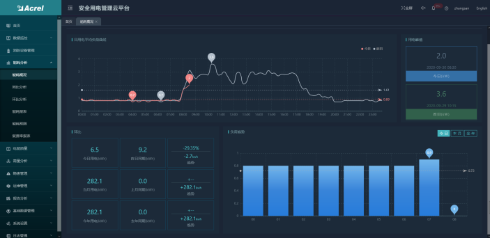 平台可按照配电回路、区域、分项、部门统计日、月、年用电数据,并进行同环比分析,同时系统提供分时段电能及费用统计、实时需量、四象限电能、平均功率因数计算等功能,为用户提供多维度数据服务。