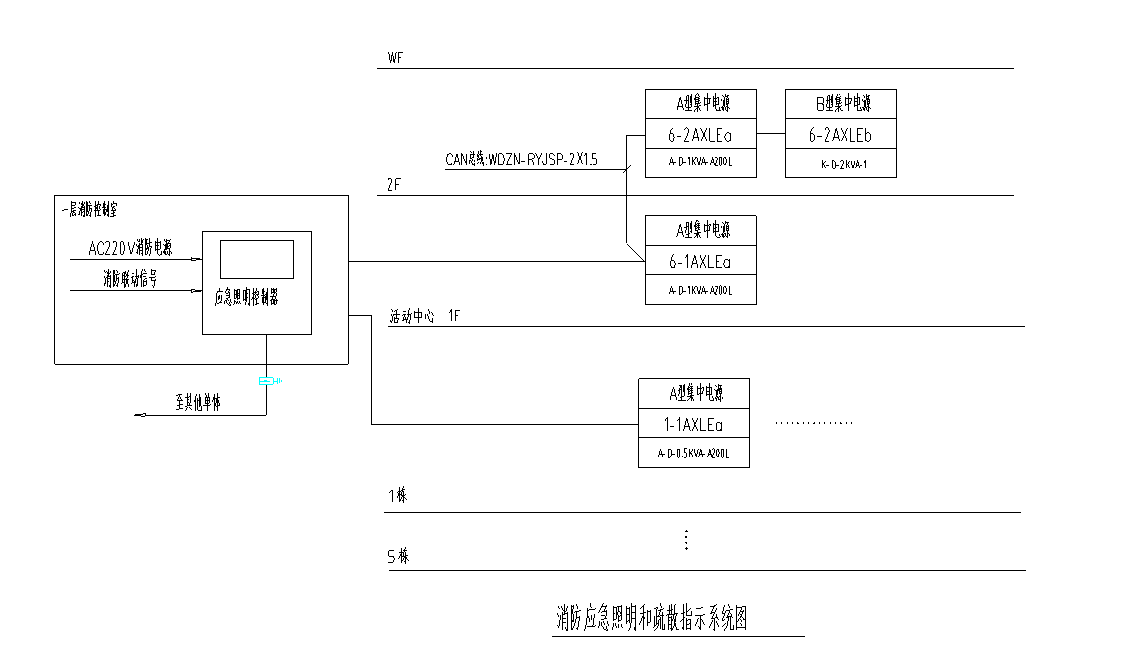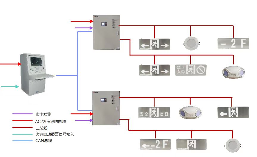 本项目采用的方案是,琴台主机到集中电源采用CAN总线的通讯方式,以手拉手的方式进行连接;集中电源到灯具采用二总线进行通讯并供电,集中电源放置在一层配电间内,集中电源到灯具的连接以手拉手、树形、星型进行连接。