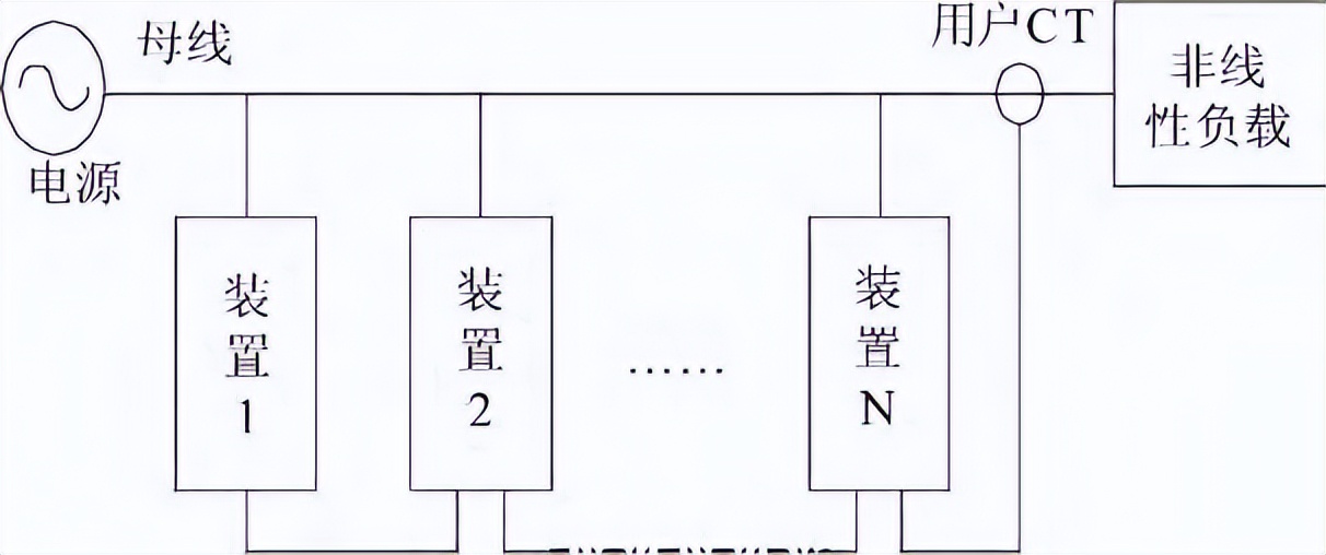 传统的多台装置并联方式如图1所示[3],N台APF分别接到母线上,用户CT的二次测量线路通过串联的方式接进各个装置。每台APF装置根据所测量得到的负荷电流谐波,分别输出1/N的谐波补偿电流,使输出电流总和达到所需的补偿电流。在这种并联方式下,其控制方式和单台运行时类似,各装置独立运行。但如果某个装置发生故障退出运行,其它装置仍将按照1/N的方式输出补偿电流,造成谐波电流不能够正常补偿。另外,这种并联方式通常只能采用通过测量负荷电流计算补偿电流,但在实际配电系统中很多情况下只能通过配电柜CT测量到总网侧电流。由于各并联APF装置的输出电流同时对网侧电流产生影响,各APF装置不能独立将负荷电流测量出来,因此很难得到准确的补偿电流,使这种并联方式的应用场合受到很大的限制,如图1所示。