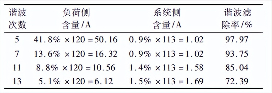 46.5%、46.3%和47.5%下降至7.4%、7.9%和6.8%。负荷侧谐波含量比较大的5、7、11次等谐波电流补偿率对谐波电流的补偿效果也很明显,补偿率见下表1。