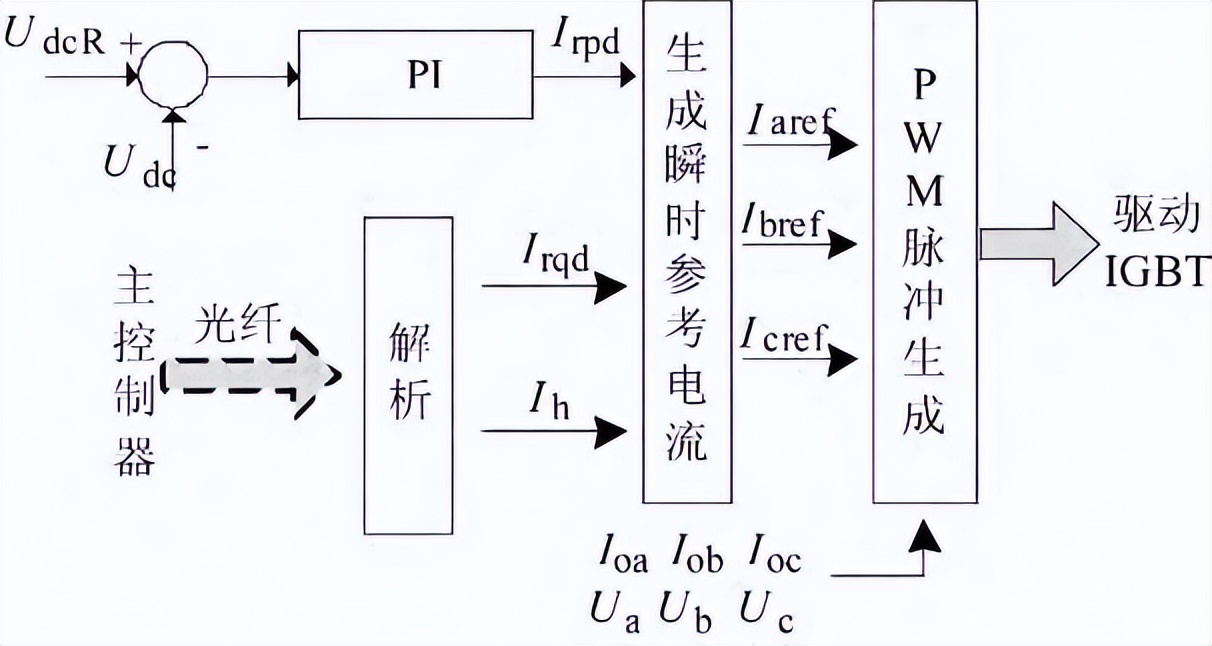 从控制器对主控制器下发的补偿值进行解析,同时对直流电压进行控制计算出相应的有功分量,各参考分量进行耦合得到各相补偿参考电流,*后采用电流跟踪算法生成PWM脉冲驱动IGBT动作,输出相应参考电流。