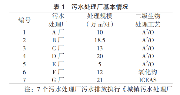 为研究我国典型城镇污水处理厂的能耗水平及 主要电耗分布情况,笔者对我国不同地区的具有代表 性的污水处理厂开展实地调研。其间挑选 7 座连续稳 定运行两年以上(运行不间断)、负荷率不低于 80% 的污水厂,并进行分区用电量监测,污水厂基本情况如表 1 所示。