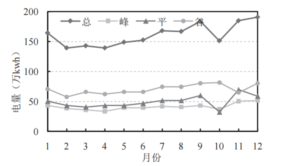 X 厂设计规模为 20 万 m3 /d,水量变化系数设计 值为 1.3,运行负荷为 80%,处理工艺为氧化沟工艺, 出水水质执行《城镇污水处理厂污染物排放标准》 (GB 18918—2002)一级 A 排放标准,平均吨水电耗 为 0.24 kW·h/m3。X 厂所在城市峰平谷三个时段分别 为 8 h,从图 3 可以看出,峰期用电量较为稳定,月 均为 40 万 kW·h 左右,占总用电量的 25.7%,比重较少;平期用电量均衡,占总电量的 30.6%;而主要 电耗集中在谷期,占总电量的 43.7%。根据该厂所在 城市的电费收费标准,大工业用电电费峰值为 1.016 7 元 /(kW·h) (6-8 月为 1.078 8 元 /(kW·h)), 平值为0.675 元 /(kW·h),谷值为0.420 3 元 /(kW·h), X 厂通过错峰用电,每年可节省电费约 100 万。