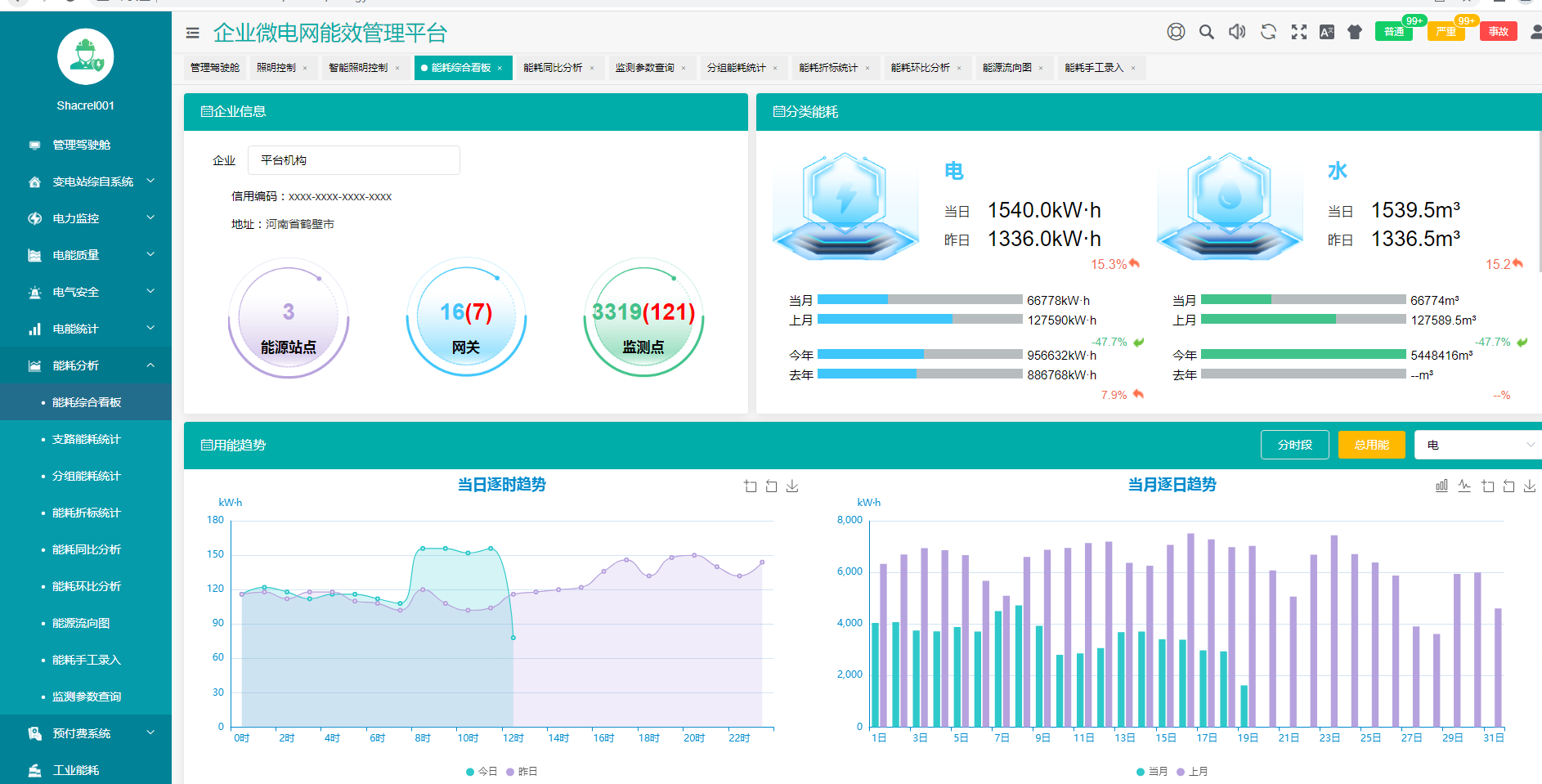 监控管理层设置在综合能源管理中心,配置能源管理数据服务器和监控主机,通过水务综合能效管理系统,完成对厂区配电系统、主要用能设备如电机、风机的远程数据采集和实时监控,并对数据进行统计分析,以曲线、棒图、饼图、散列等方式呈现给用户,方便值班人员时刻掌握各工段的运行参数和状态,全厂需量、电能及其他重要统计数据,同时预留数据上传上一级水务系统的通讯接口。