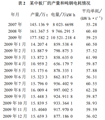 以某钢铁集团中板厂为例, 能源(电力) 数据采集管理仍是人工采集或电话采集, 没有实时在线的能耗数据采集与监控。电能由变压器进入分厂后, 各个耗能设备无数据采集和监测管理, 甚至一些设备也没有能耗监控。这种情况下要抓好能源的有效管理和取得节能减排的成绩十分困难, 主要是基础太差。目前该中板厂的吨钢电耗平均为60 kW h左右(见表2)。这与国内外同行业先进企业能效指标对比还是较落后的。虽然中板厂也采用了部分自动化控制, 但在目前的生产过程中, 仍然主要依靠人为的主观管理, 并非先进的科学化的管理, 因此很难继续降低电能消耗。为此须采用自动化、信息化技术来改造生产和管理, 从而进一步取得节能效果。