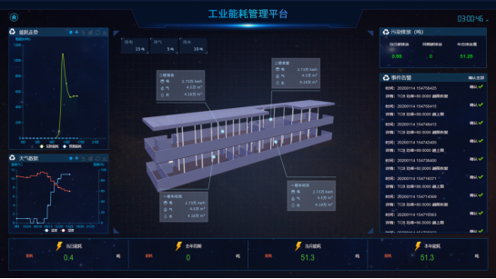 大屏展示企业水电气当前用量、能源消耗趋势、产能走势、各类能源占比、各类能源消耗日/月/年同比,以及当前天气情况、污染情况,并三维展示企业重要工艺或工段的能源消耗动态。