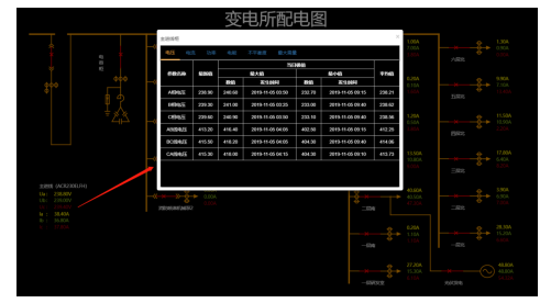通过矢量配电图监测变电所用电情况,画面响应遥信变位、遥测越限报警,点击某个配电回路后可以查询该配电回路的各类详细用电参数,包括实时值、平均值;