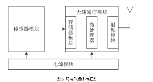 1)终端节点:传感器定时自动采集监测数据并及时上传给无线中继器,经由无线专网传送至上位机监测中心,分析数据并发出自动预警信号。终端节点的结构如图6 所示。