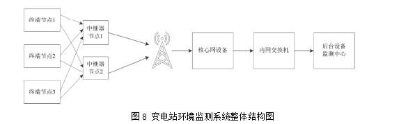系统网络协议采用用户定义的形式,采用半双工通信方式,每个通信节点的网络地址。单个通信节点和无线中继器之间的通信链路的建立和终止由节点的工作模式确定。正常工作模式下,建立通信链路并由通信节点释放,按照既定规则进行处理;维护模式下,通信链路建立和终止由无线中继器进行处理;原则上,无线中继器应主动规避通信节点的上传时间。各个传感器利用RTC 和EEPROM 实现唤醒、数据采集和存储功能,并通过内置安全芯片实现安全认证和数据加密解密等功能。 数据被传输到中继器节点中,数据的完整性和安全性得以保证。变电站环境监测系统的整体结构如图8 所示。