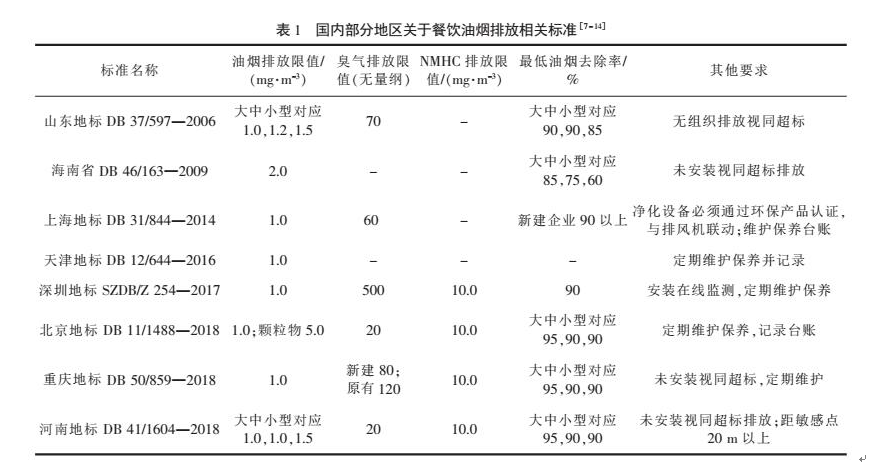 针对目前现行国家标准不足,山东、海南、上海、天津、深圳、北京、河南、重庆等地区环境部门根据各地区餐饮业分布特点、菜系特征以及油烟排放对大气的影响制定了符合本地区的餐饮油烟排放标准。上述几个地区餐饮油烟排放相关标准中关于油烟、臭气、非甲烷总烃(NMHC)排放限值及净化装置去除效率比对见表1。