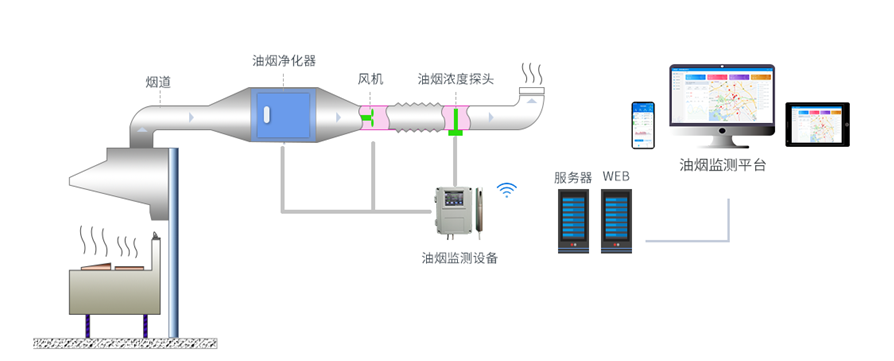 对油烟排污数据的监测,包括油烟排放浓度,颗粒物,NmHc等数值采集监测;同时对监控风机和净化器的启停状态、运行数据进行监测。