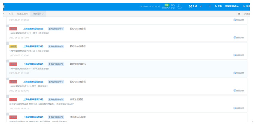系统根据采集的油烟数值大小,产生对应的排放超标告警;对净化器的运行数据分析,上传净化设备对应的运行、停机、故障等告警事件。