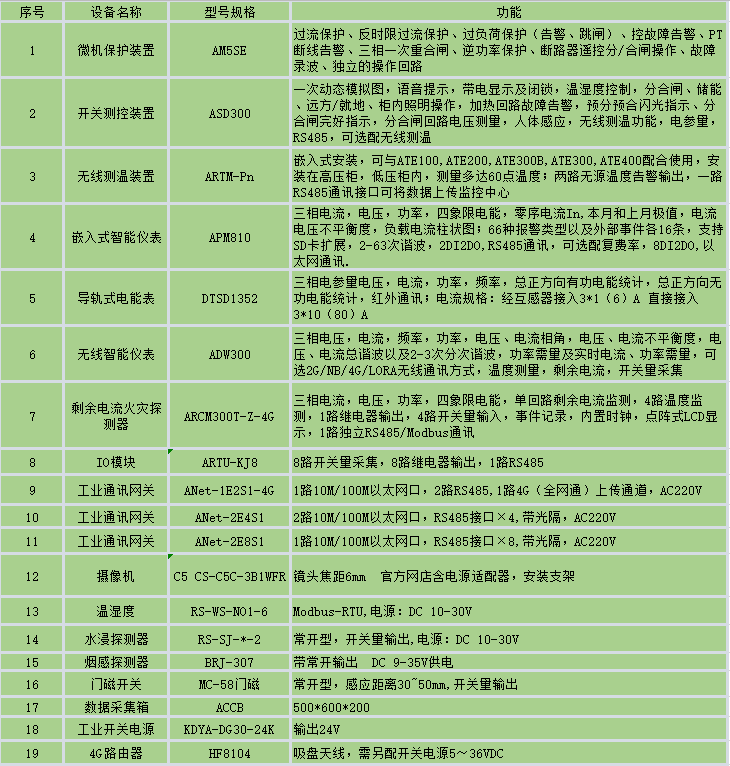 35kV及以下电压等级的变配电站及设备的保护测控功能,至少包括35kV进线/主变压器(一般容量2000kVA以上)/PT/母联、10kV进线/馈线/配电变压器(一般容量2000kVA以下)/高压电动机/高压电容器/母联/PT等设备的保护和自动控制功能。