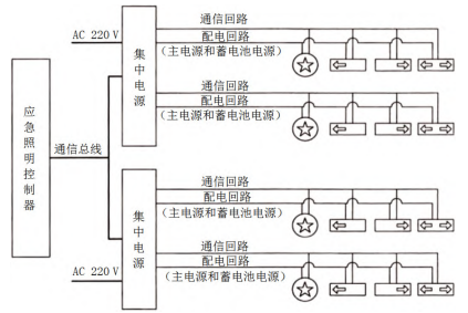 集中控制型系统与非集中控制型系统相比,不同是具备应急照明控制器,它是集中控制型系统的核心控制部件,主要功能是接受火灾报警系统发送的系统应急启动触发信号,按预设逻辑自动控制系统的应急启动,同时实时显示灯具、应急照明配电箱或集中电源等系统部件的工作状态。应急照明控制器通过总线与集中电源相连,集中电源再与灯具相连,从而实现通信功能。同时,控制器与火灾自动报警系统主机相连,在火灾发生时,可以根据探头探测的火源发生地,智能控制疏散指示灯的启闭,给出安全的疏散逃生路径,指引安全逃生方向。