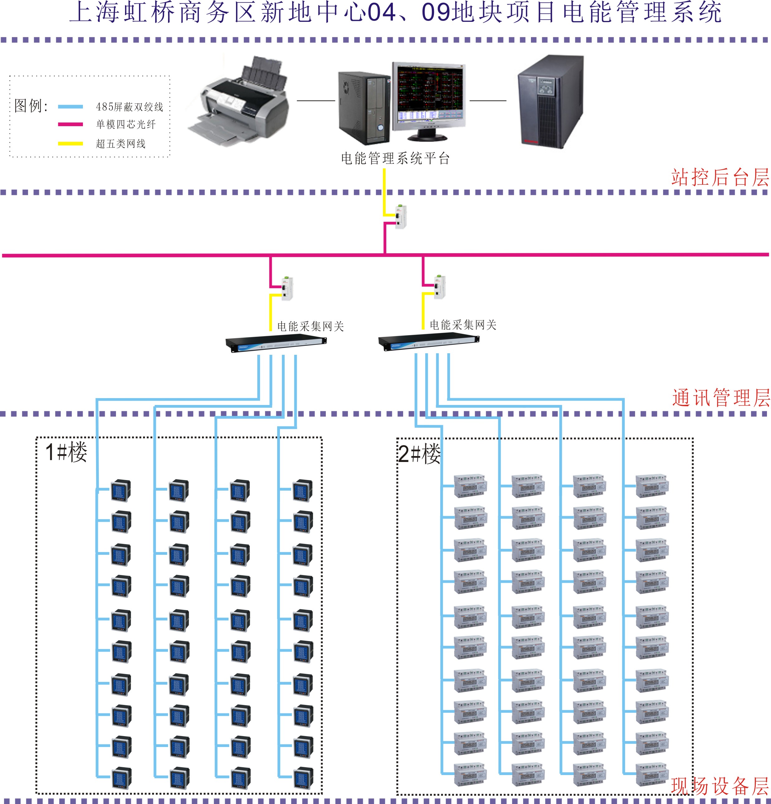 本项目为1号楼做一套电能管理系统,1号楼包括5个核心筒,共315个计量点,通过屏蔽双绞线手拉手连接成16条总线。再通过2台串口服务器将数据上传至电能监控网络,可以通过本地电能管理平台进行监测,通时也可通过能耗网关上传至上级能耗监测平台。