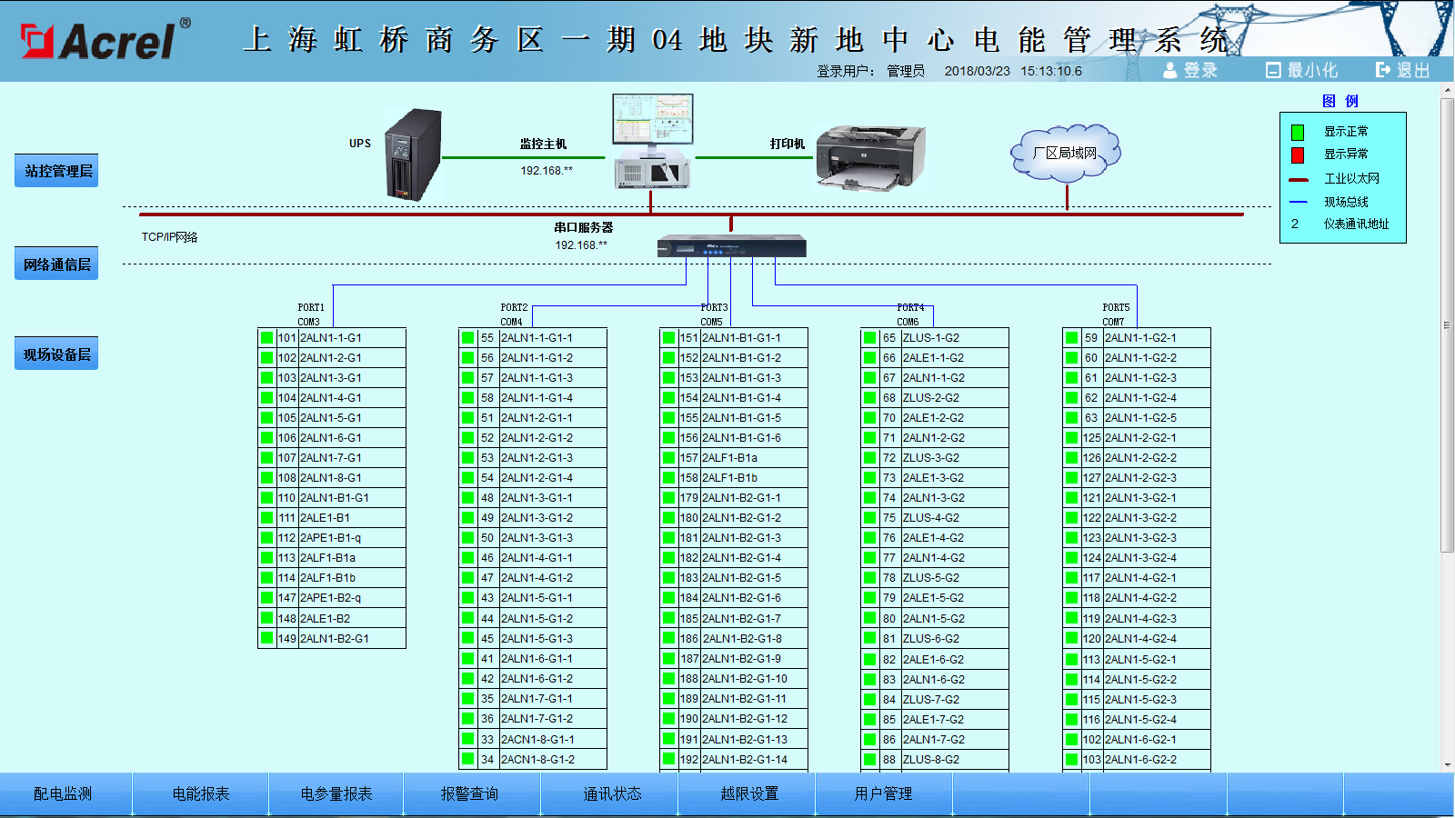 上位机软件采用ACREL-3000电能管理系统,通过软件进行设备配置、数据库变量配置、界面设计等,完成了在上位机软件监控及电能管理的功能。