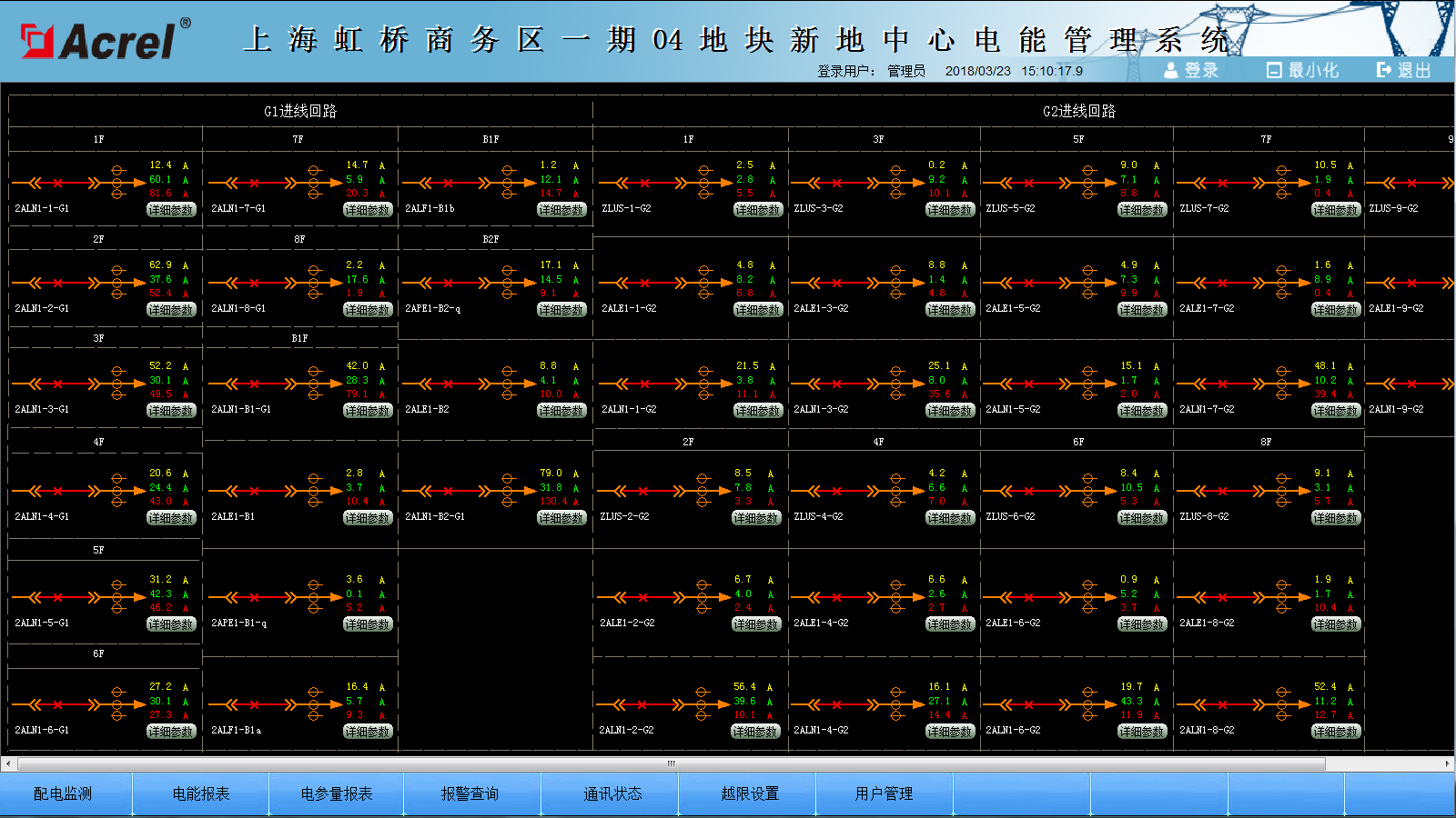 监测详图反应了整个系统配电回路名称,相应的配电体系以及回路的主要电参量。通过实时数据的显示,直观反映本项目各个监测回路的运行数据,便于管理者实时了解系统运行状态。界面如图3所示。