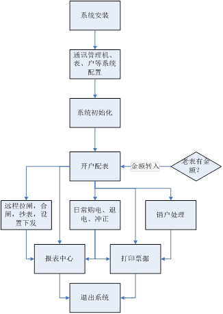 本系统分为五大模块,分别是操作员登陆模块、系统配置模块、用户(商铺)管理模块、售电管理模块、报表中心模块,系统大致运行和操作流程如下:
