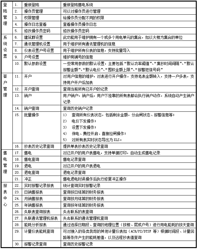1.电价下发;2.设置下发(下发报警金额阈值和过载功率阈值);3.保电(强制仪表合闸);4.恢复预付费(欠费自动跳闸的模式);5.拉闸(强制断电);6.抄表导出(导出当前所有表状态为EXCEL)