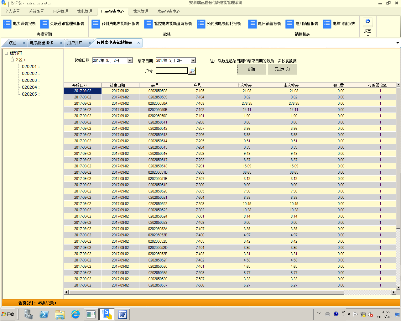 系统还提供了多个报表以供查询,分别是日/月/年财务销售统计报表、失联表/通讯管理机查询报表、能耗查询报表、实时报警/历史报警查询报表,支持导出。以下是财务报表和预付费表日用能查询报表: