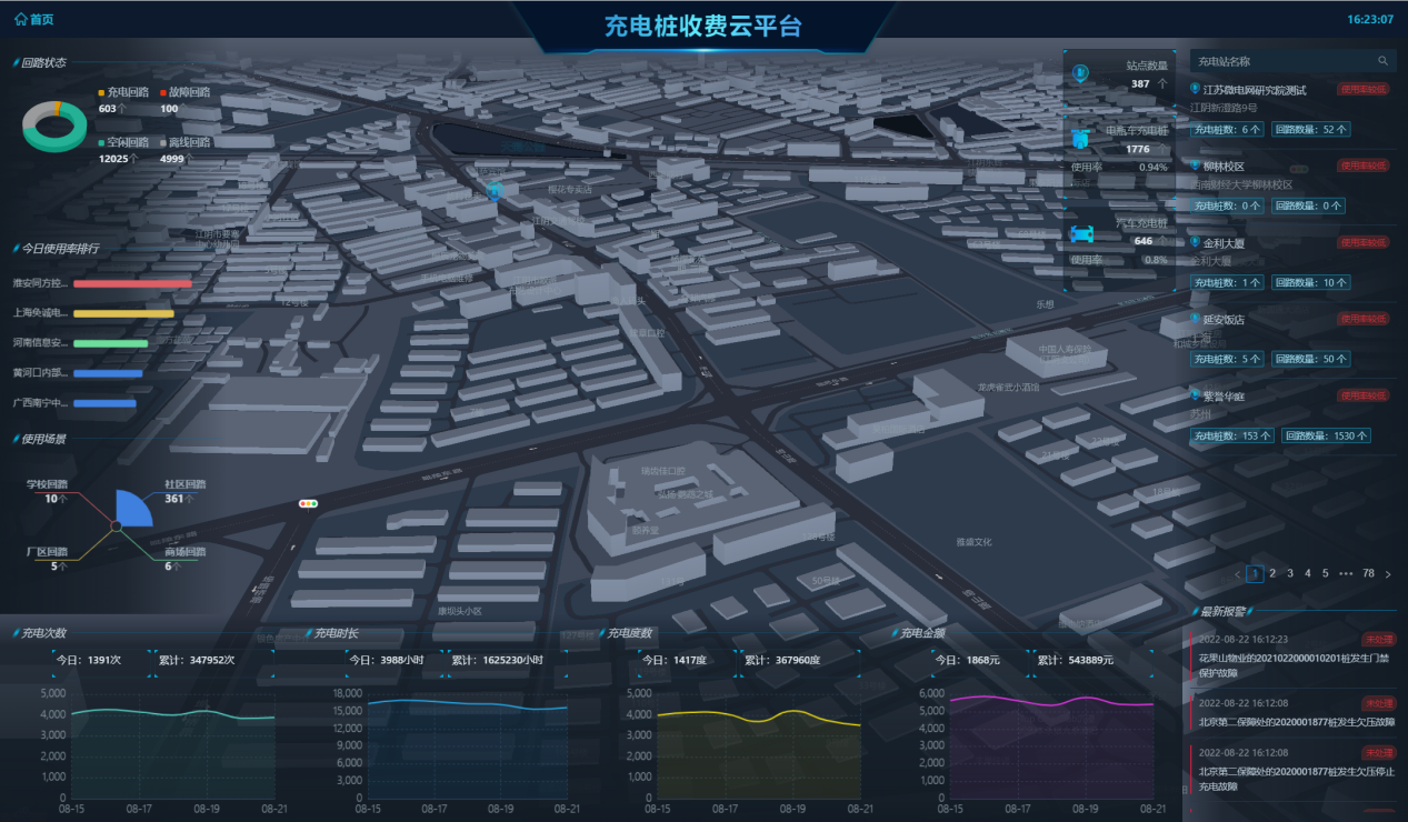 实时监视充电设施运行状况,主要包括充电桩运行状态、回路状态、充电过程中的充电电量、充电电压/电流,充电桩告警信息等。