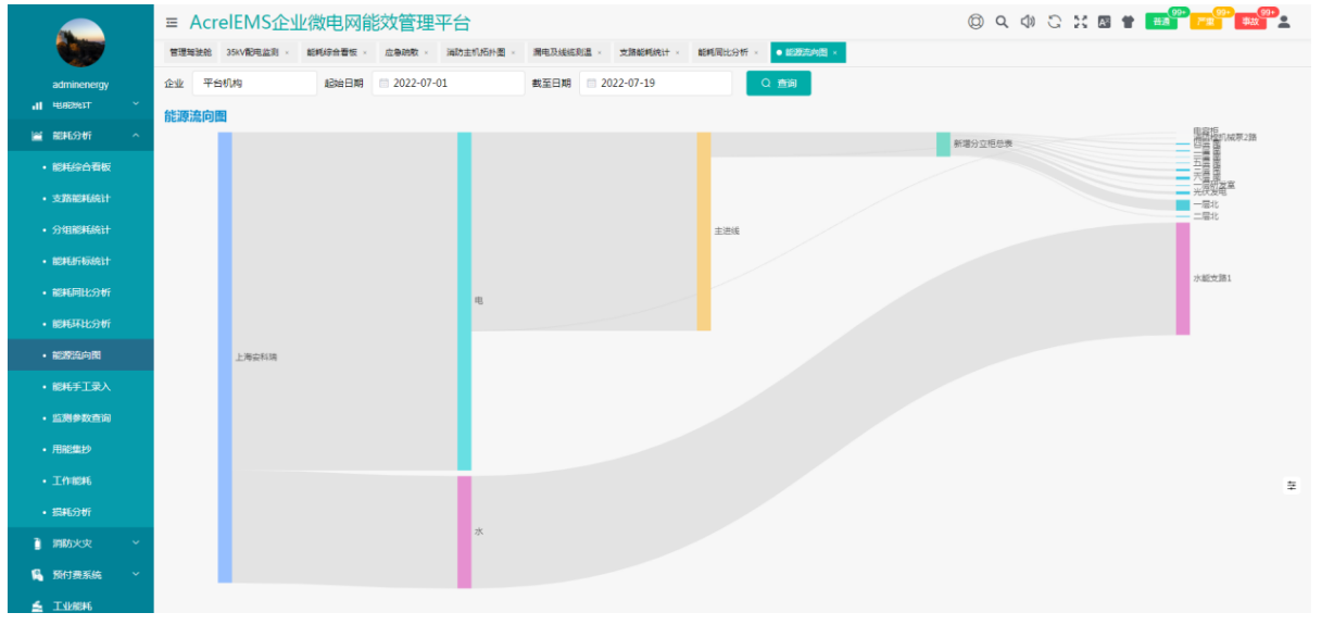 为水务搭建计量体系,显示水务的能源流向和能源损耗,通过能源流向图帮助水务分析能源消耗去向,找出能源消耗异常区域。