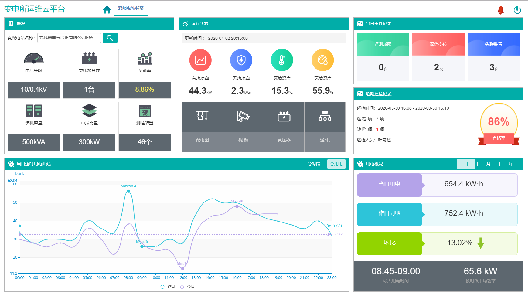 支持大屏展示用户运维变电所概况、环境监测、实时电压、实时负荷、实时电量、配电图等。