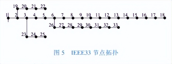 本文仿真过程选择在IEEE33节点配电网中进行,其拓扑如图5所示。假设节点1为平衡节点,即电源接入节点,余下32个节点全部为PQ节点。假设整个配电网系统中含基础负荷以及1500辆电动汽车,车群被均匀分配到节点19,23和26中。以私家车比亚迪E1车型作为研究对象,规定每辆电动汽车的动力电池规格相同,参数为:220V,16A慢充模式,限制容量为35KWH,3.52KWH恒功率充电,充电效率为0.82,转换效率为0.90