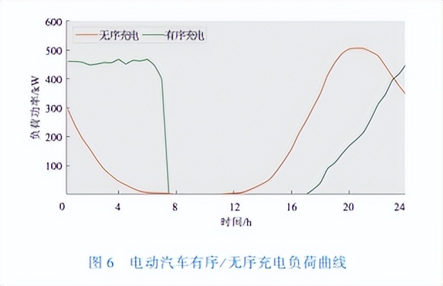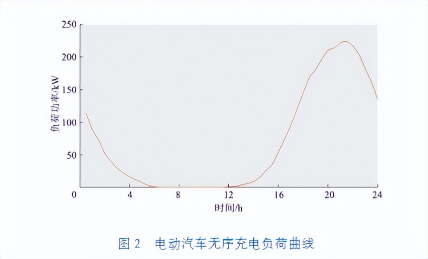 式中:fe为车主启程离家的概率密度函数;v为离家时刻。结合用户出行数据及电动汽车充电模型利用蒙特卡洛算法,得到500辆电动汽车的24h无序充电负荷曲线,如图2所示。