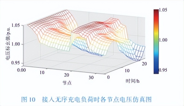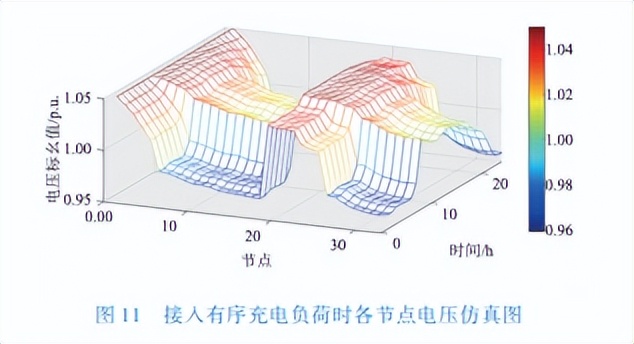 由图9可知,场景1配电网未接入充电负荷时的电压偏移都控制在±7%以内,纵横对比没有发现严重的电压偏移现象,但是节点18和19在20.00-21.00时间段上有局部节点处在越限边界。由图10可知,场景2中配电网内接入无序充电负荷时,节点13-19和28-33在晚间出现电压越限情况,原因是无序充电负荷的高峰期恰巧与网内基础负荷用电的高峰期时段相叠。
