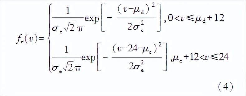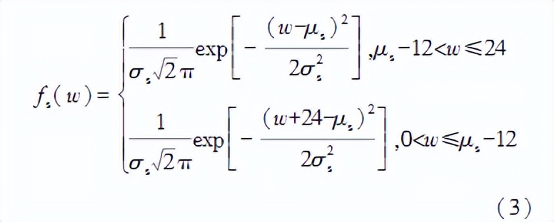 式中:fs为车主比较后规程的概率密度函数;w为回家时刻;μs为期望值;σs为标准差。dư车主离家时间假设车主每日用车期间只可放电不可充电,出行开始时刻的概率密度函数为