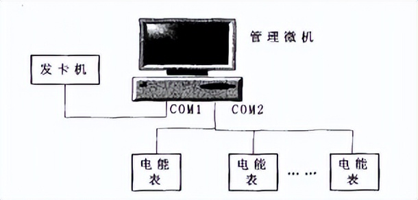 为了降低成本,管理微机既作为电能表用电管理上位机,同时还和发卡机一起完成发卡任务。电能表管理系统如图1所示。