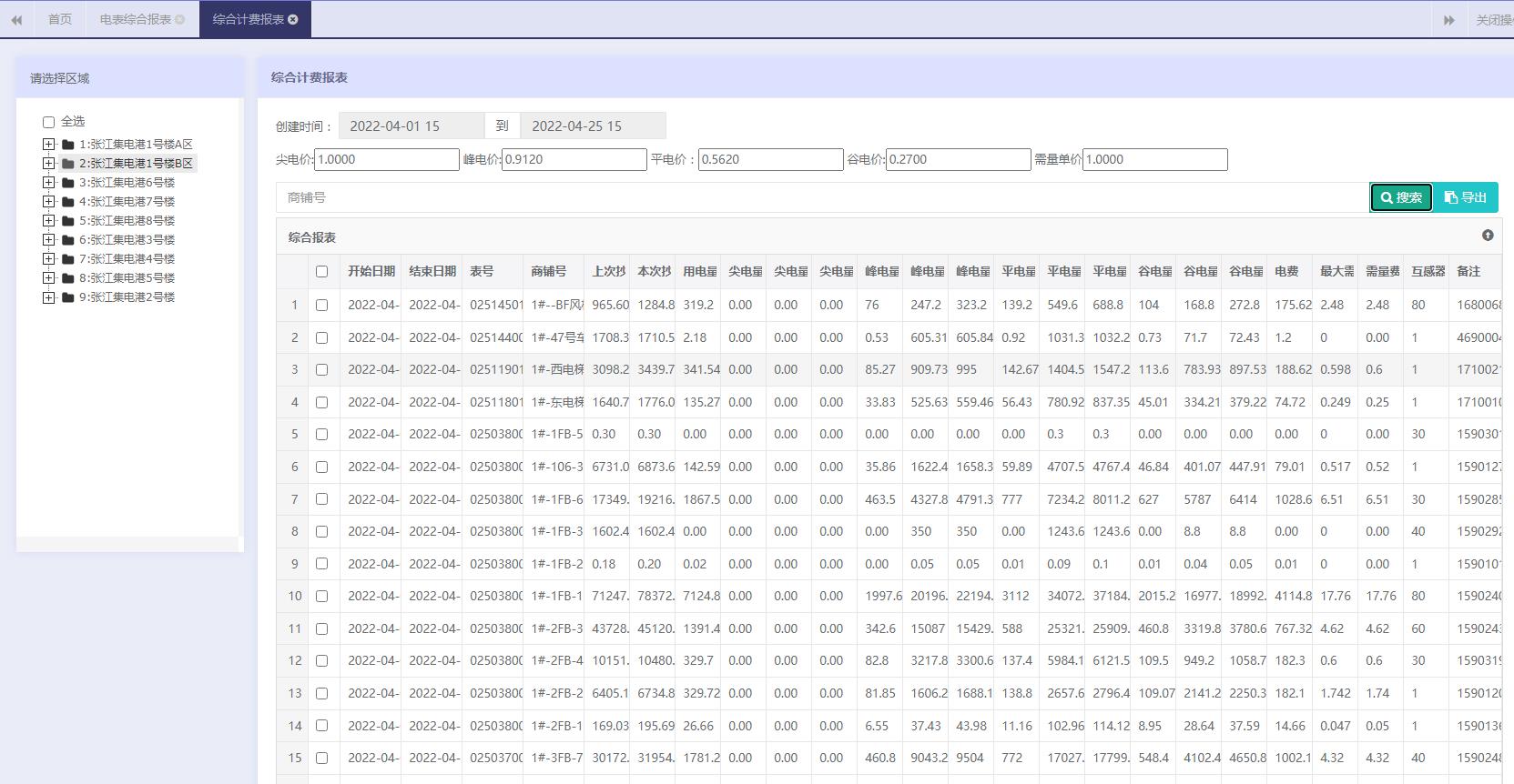 系统还提供了多个报表以供查询。用电综合报表,帮助财务统计每个月商铺总用电量,尖峰平谷用电量以及电费,能耗同比分析,可以比较每个月份与去年同期相比的用能差距。能耗日月年报表,按日,月,年三个不同维度查询电表每个阶段的用能情况。