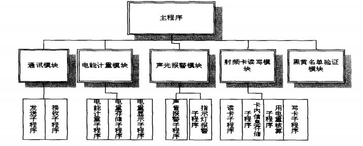 软件采用模块化设计,共划分为五大模块(如图3),分别为与管理微机的通讯模块、电能计量模块、声光报警模块、射频卡读写模块以及黑黄名单的验证模块。为了实现每个大模块的功能,又把每个大模块划分为若干个相应的功能子程序或小模块。主程序的作用是系统的初始化、中断管理和监视以及各功能模块的调用等。