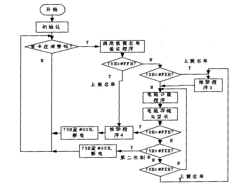 设定MCU内部RAM的78H作为黑、黄名单标志单元,当78H数据为#FFH时,指示用户卡已上黑名单;当78H数据为#FEH时,指示用户卡已上黄名单;为其它数据则表明用户卡未上黑(黄)名单。在进行黑、黄名单验证时,程序根据验证结果对RAM的78H写入对应的值,以供主程序判断。RAM的79H作为在有无刷卡标志单元,如电表当前已有用户卡在消费,79H的内容为#FFH;当无用户卡在消费(电表处于待机状态)时,79H的内容为#00H;当正在消费的用户卡第二次刷卡后,79H的内容为#FEH,此时主程序检测到这一状态后,断开用户供电,计算本次用电后用户的电费余额,且将余额回写射频卡。