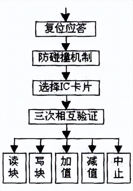 MFRC500能执行有限的一些指令,并将这些指令传输到MIFARE1用户卡片上,单片机对MFRC500的某一指令操作不是简单的一条指令所能完成的,需要有一个程序序列来完成,其中有对MFRC500硬件内核寄存器的设置以及判断。在进行读写数据或增、减值操作之前还需要经过复位应答、防碰撞、选卡及认证过程。操作流程图如图6所示。本设计采用基于KeilC的C语言进行编程,调用Philips公司提供的基本库函数来实现各种功能。