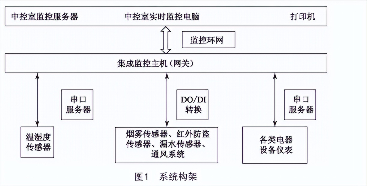 隧道配电房智能监控管理系统由智能设备、传输线路和集成监控主机组成。配电房内所有设备通过以太网、串口服务器接入到网络内;集成监控主机直接接入监控以太网,与中控室网络相连,从而实现数据交互,系统构架如图1所示。该系统采用集中管理、分散控制的方式,不但满足了对分散监控点集中统一管理的需要,更满足了数据安全等方面的要求。