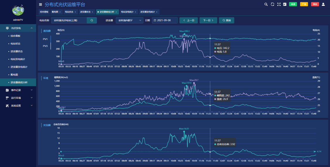 ●展示交、直流侧电压、功率、辐照度、温度曲线。