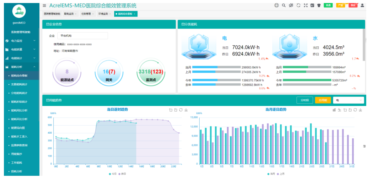 AcrelEMS-MED医院能源管理平台充分结合《医疗建筑电气设计规范》《绿色医院建筑评价标准》、《医院建筑能耗监管系统建设技术导则》等行业规范、根据医院用户需求以及能源管理部门要求,采集分析能源、能耗、能效数据,监测以电能质量、智慧用电相关指标以及其他用能指标,并与国家能源政策与用能模式改革结合。能够辅助医院后勤管理人员进行能源供应系统及设备的运行管理工作,帮助医院管理层实时掌握医院的能耗情况,为医院能源信息化建设和节能管理提供了良好的技术平台。