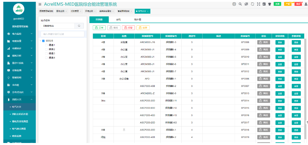 医院电气火灾监控系统以建筑为单位设置,采集数据后上传至值班室监控主机,实现对建筑电气安全预警。现场设置的传感器监测配电系统回路的漏电电流和线缆温度,异常时实时发出报警信号,重点关注门诊楼、住院楼、医技楼等区域漏电或者电缆发热等问题。