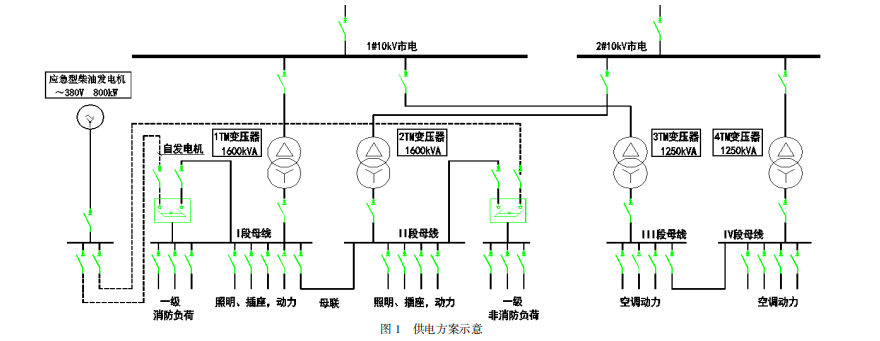 根据负荷具体情况,在-1F变电所内设置SCBH15-1600kVA 2台,SCBH15-1250kVA 2台,其中1#~2#变压器对大楼的照明、动力及消防负荷供电,3#、4#变压器对空调动力等供电。供电方案示意如图1所示。